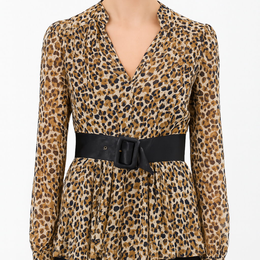 Lepršava tunika sa animal printom i naglašenim strukom zahvaljujući crnom, širokom kaišu od satenskog materijala.