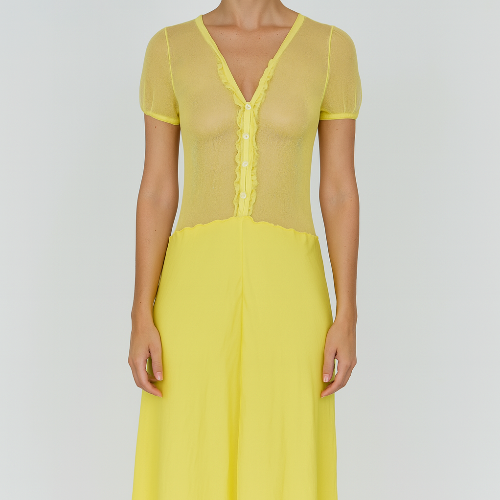 Benetton žuta haljina u veličini S, sa zanimljivim spojem materijala i tekstura.