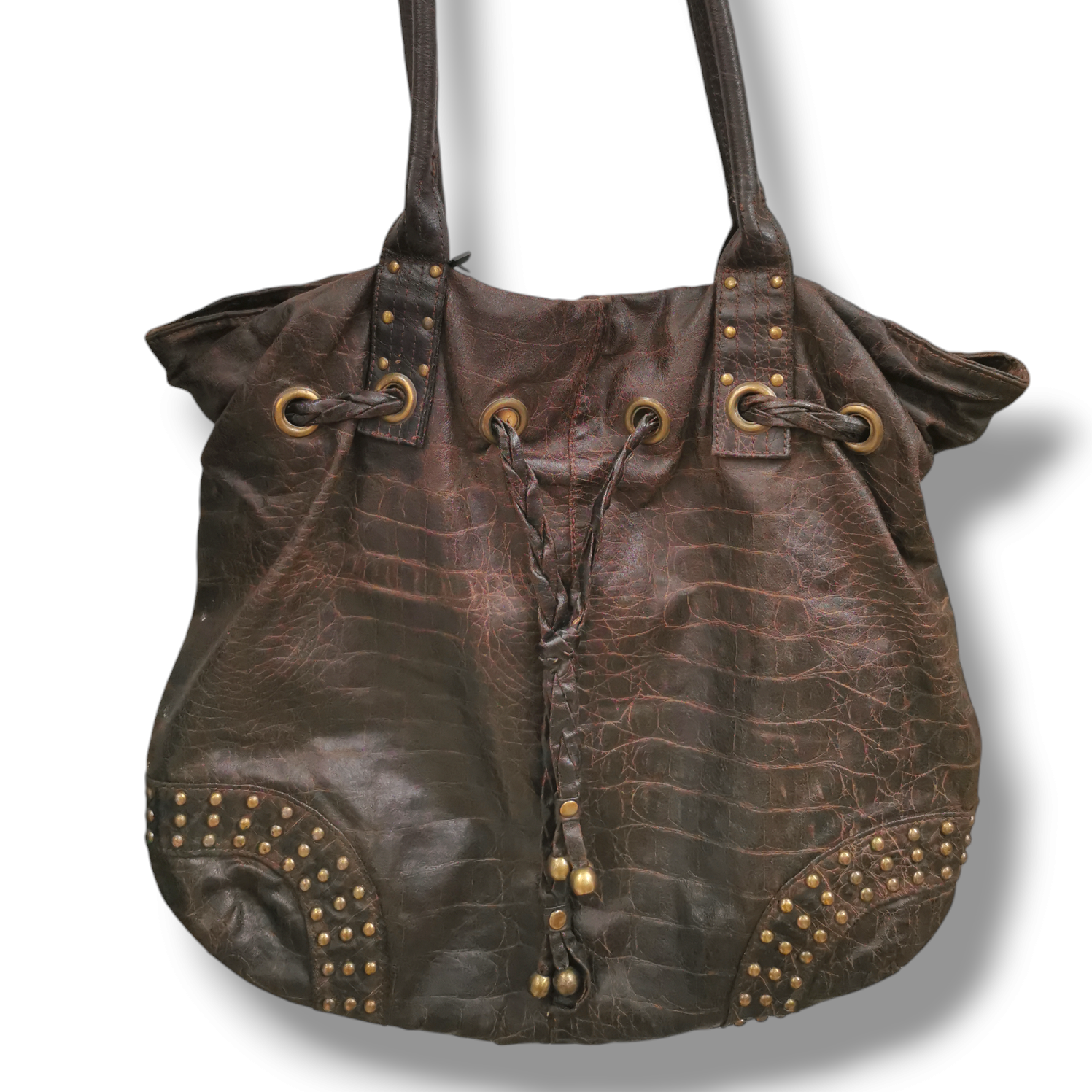 Braon vintage torba od eko kože sa utisnutim krokodilskim dezenom, ukrašena tamnozlatnim nitnama i alkama.