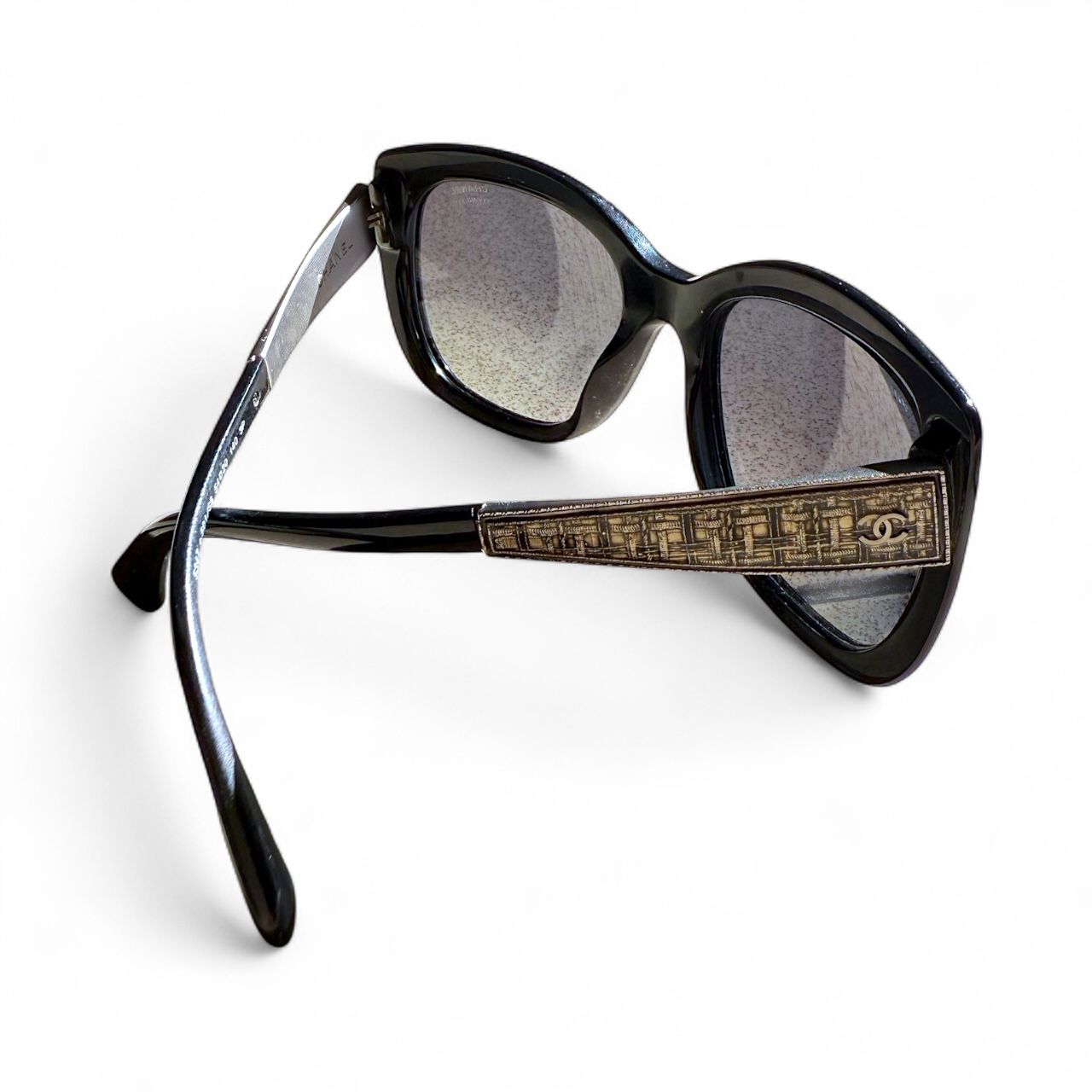 Vintage Chanel naočare crne boje sa upečatljivim bočnim detaljem u pletenom efektu i prepoznatljivim CC logoom. Model 5247 (c.501/S8) u dimenzijama 54□20 140, sa sivim gradijentnim staklima. Komad koji spaja eleganciju i nosivost – savršene za svakodnevni stil i posebne prilike.