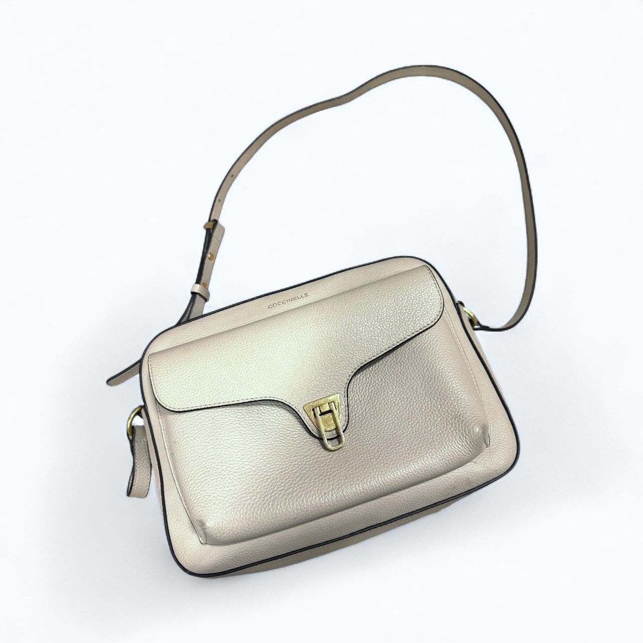 Coccinelle kožna tašna u bež nijansi - praktična i elegantna u isto vreme. Ima podesiv kaiš za nošenje preko ramena ili crossbody, kao i više pregrada kojeje čine savršenom za svaki dan. Zlatni detalji daju joj dodatnu dozu klasične elegancije, a dovoljno je prostrana da u nju stane sve što ti treba tokom dana.