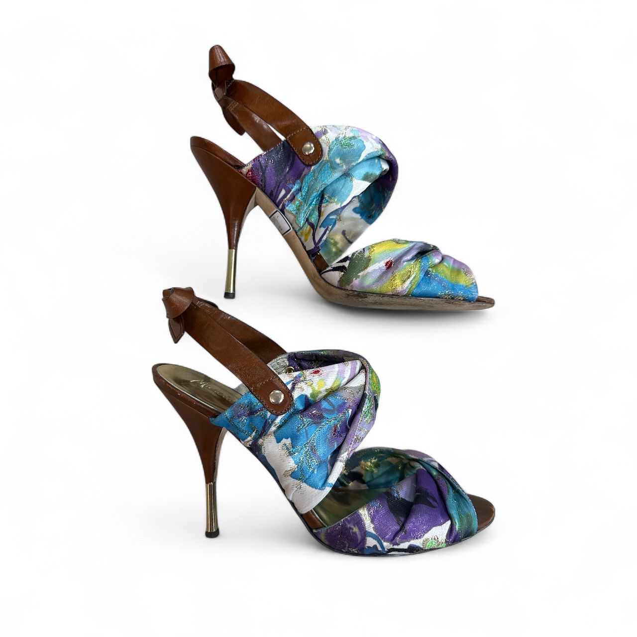 Sandale od kože i platna u šarenom floralnom dezenu, sa elegantnom potpeticom i detaljem mašne napred. Glavni komad za svečane prilike i večernje izlaske.