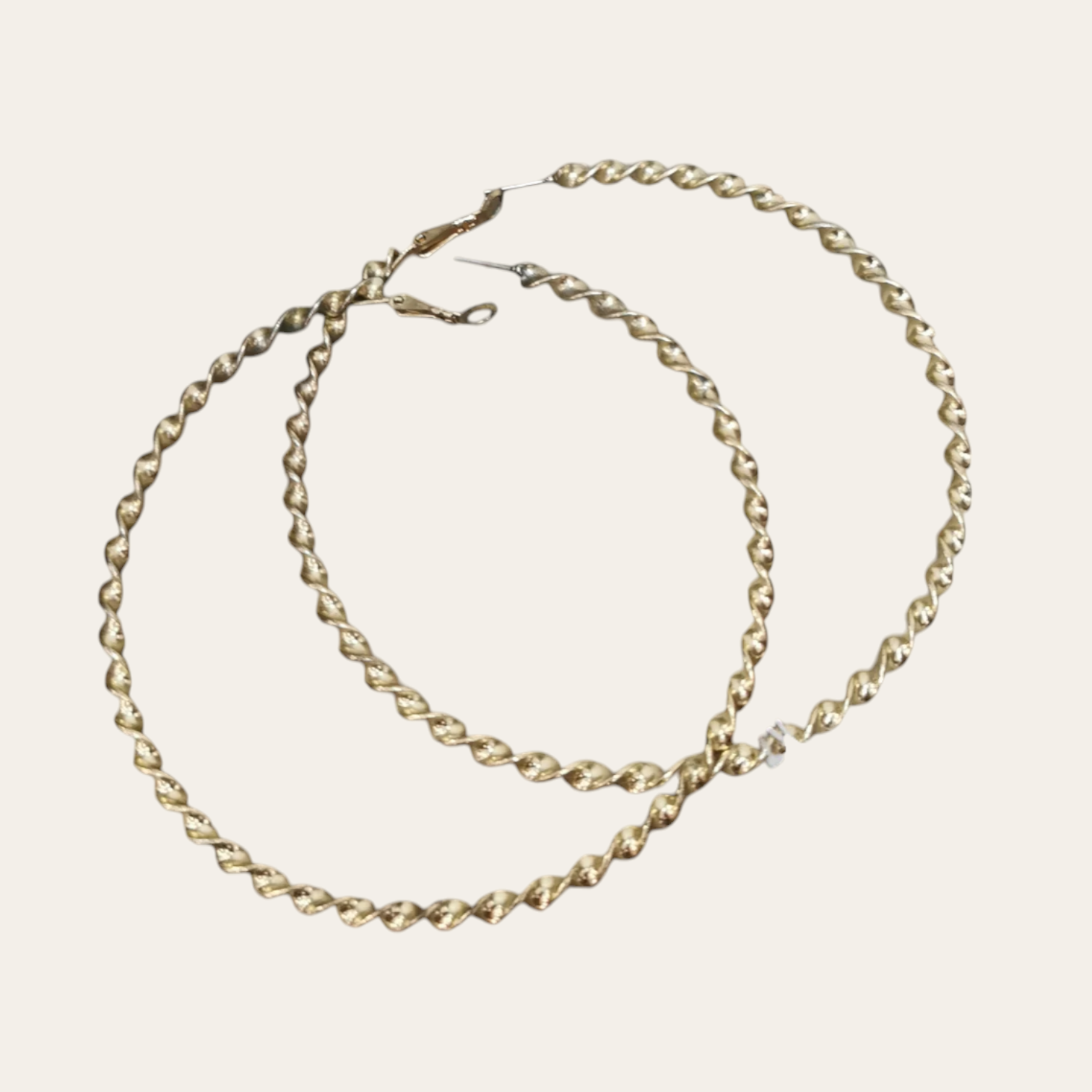 Velike zlatne vintage minđuše alke sa uvijenim reljefnim dizajnom koji odmah privlači pogled. Lagane su i udobne za nošenje, a opet dovoljno upečatljive da podignu i najjednostavniji outfit. Klasičan komad koji se lako uklapa i u ležerne i u večernje kombinacije.