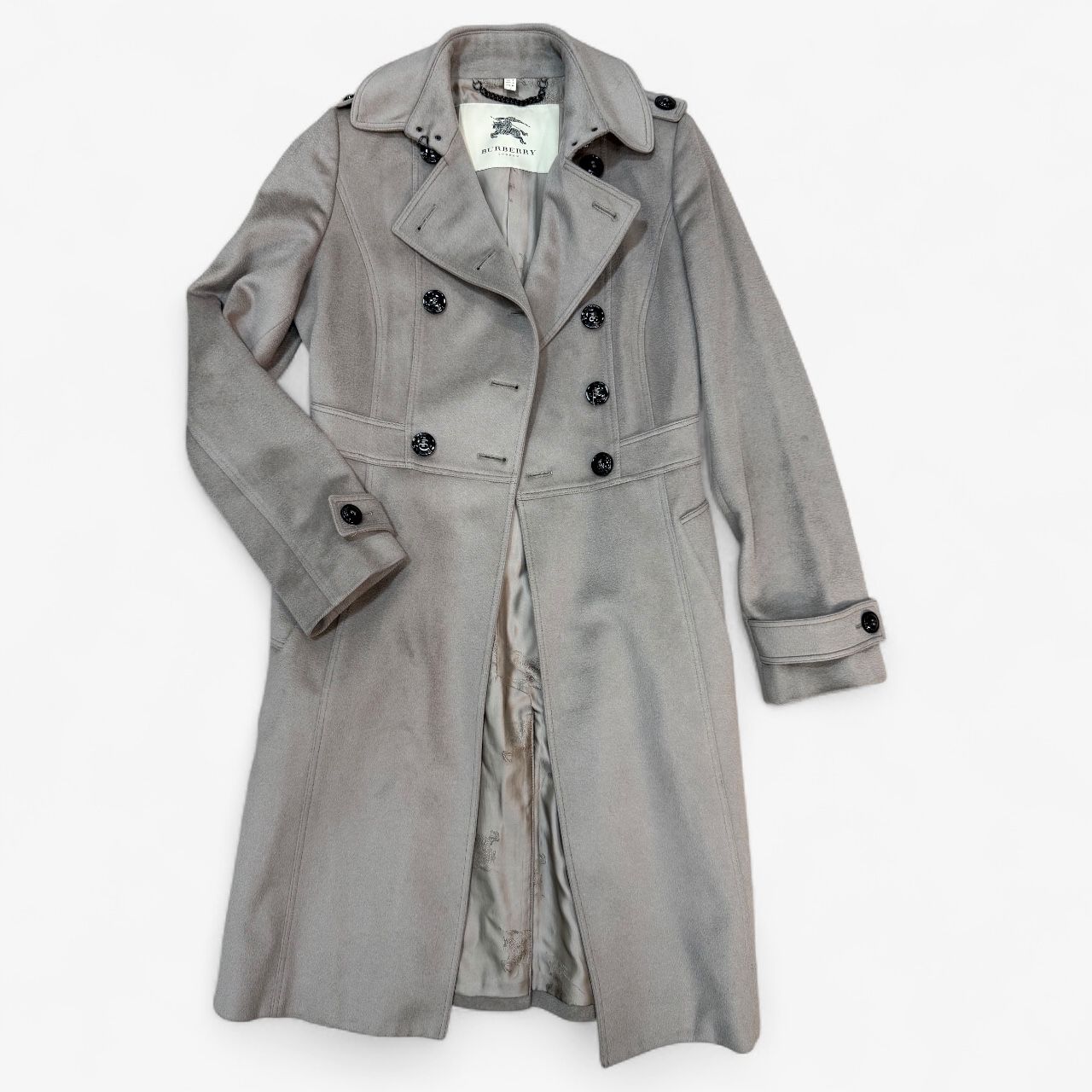 Klasičan Burberry kaput u sivoj boji, izrađen od mešavine vune i kašmira. Dvoredno kopčanje, strukiran kroj i prepoznatljivi detalji na ramenima i rukavima čine ga savršenim komadom za hladnije dane.