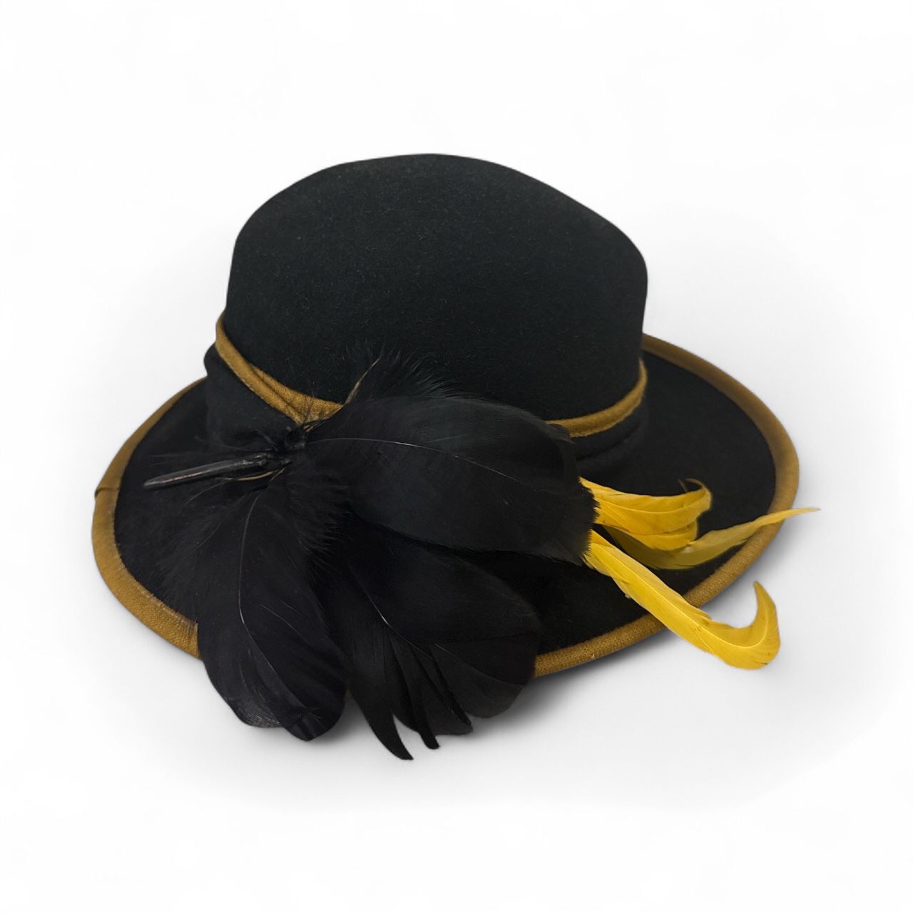 Vintage crno-žuti vuneni šešir sa detaljem perja✨️