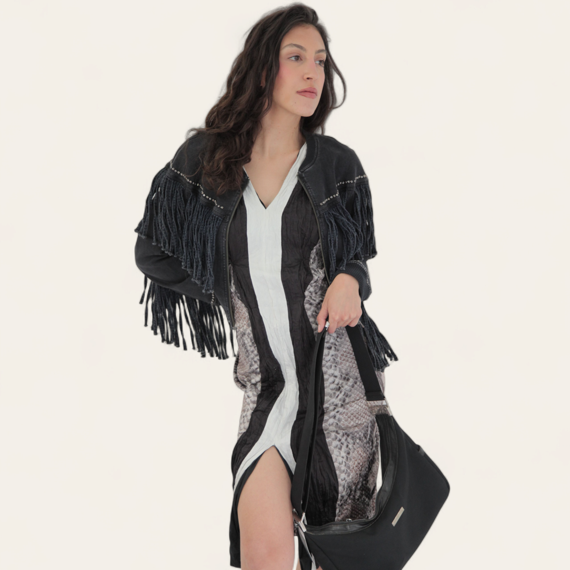 Gornji deo je ukrašen cirkonima, dok rese duž leđa i rukava dodaju pokret i dinamiku svakom outfitu. Zatvara se pomoću rajsferšlusa (riferschluss), a naznačena veličina je 38 (M). Idealna za slojevite kombinacije i statement trenutke.