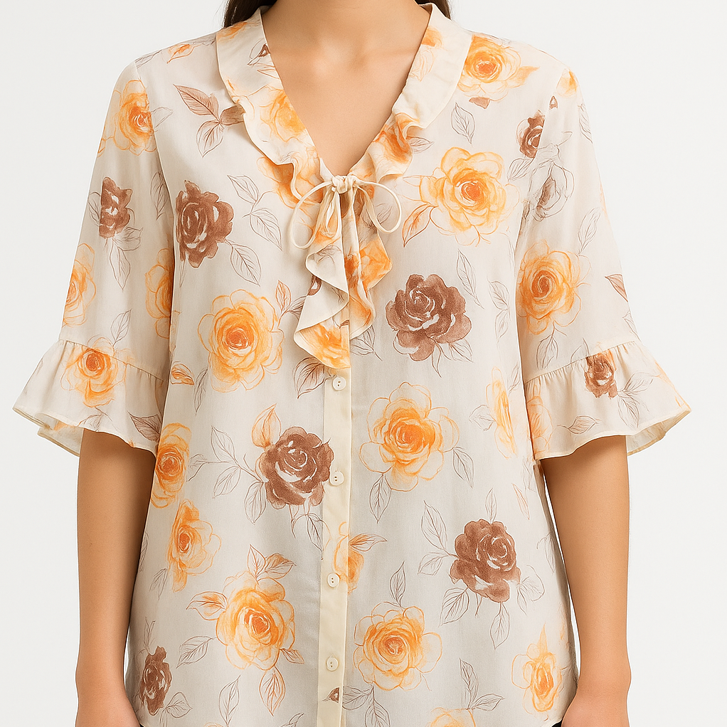 Prozračna krem bluza sa upečatljivim cvetnim printom u narandžastim i burgundi tonovima.