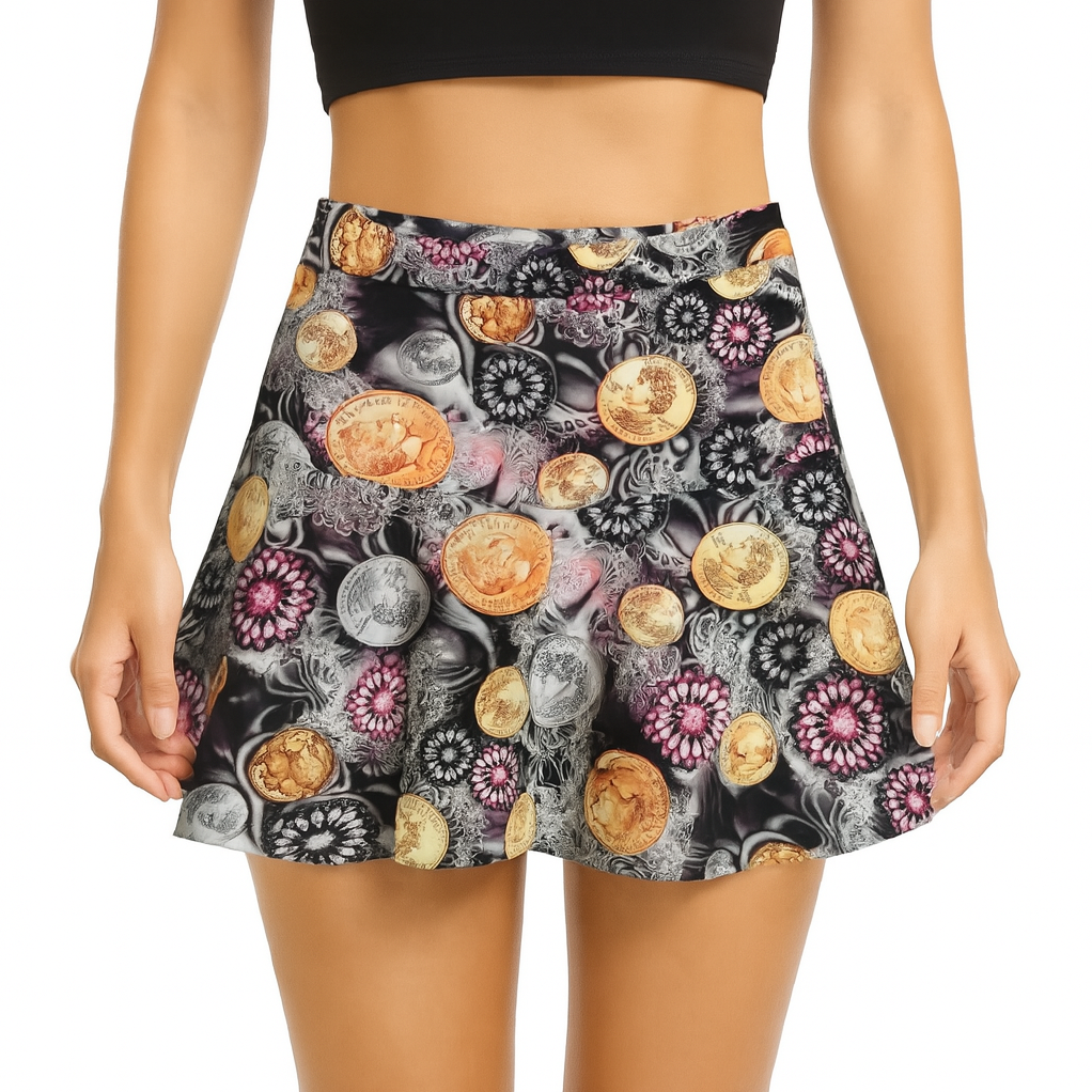 Y2K vintage mini suknja u M veličini, sa zanimljivim printom medaljona i floralnih motiva u crno-sivoj bazi sa akcentima u zlatnim, srebrnim i rozim tonovima.