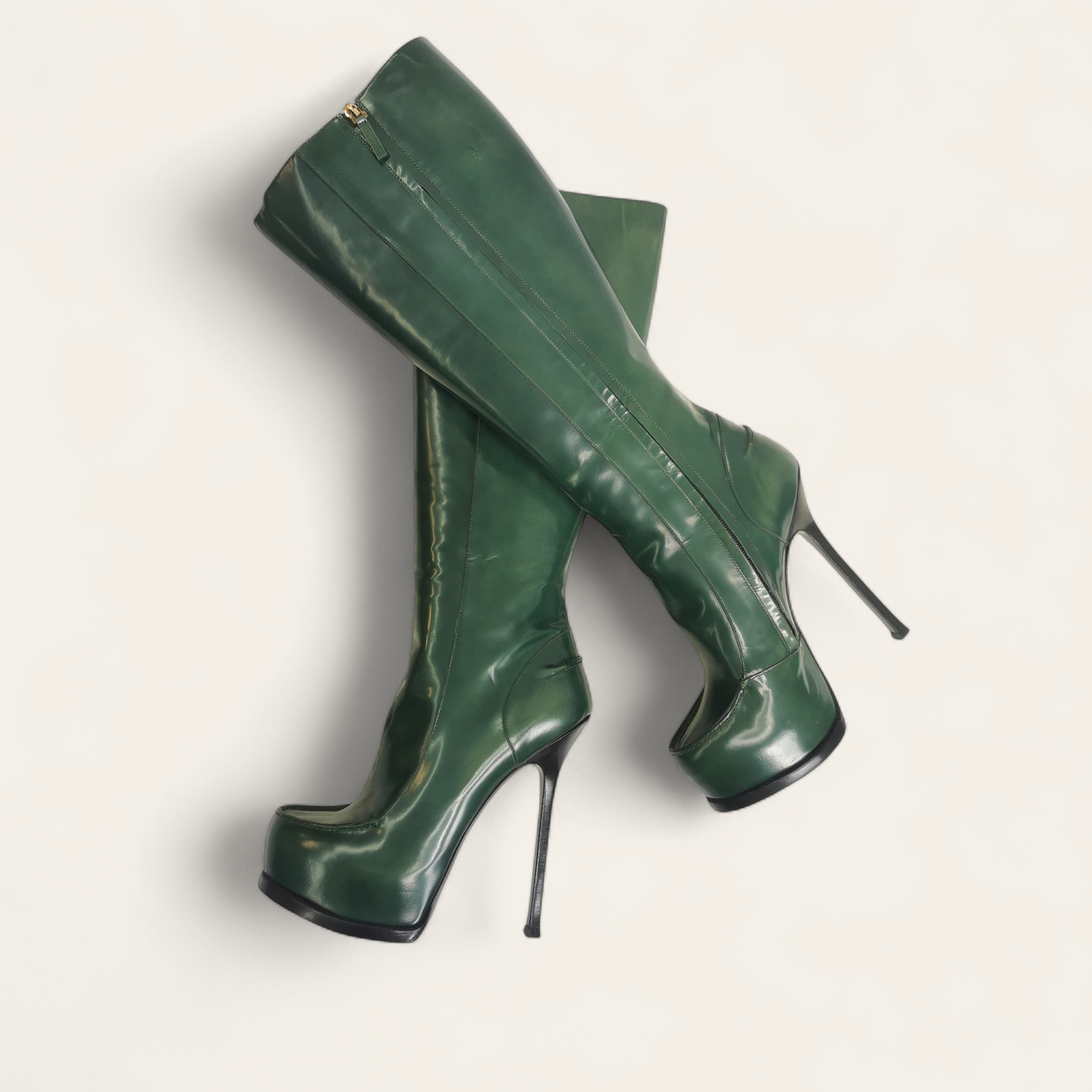 Duboke, u prelepoj tamnozelenoj boji, izrađene od glatke, kvalitetne kože. Visoka potpetica i platforma im daju ozbiljan stav, dok forma čini nogu elegantnom i izduženom. Model sa rajsferšlusom sa strane. Odlično očuvane, u originalnoj kutiji, kao nove, spremne za novu šetnju. Retki model – prava stvar za kolekcionarke i sve koje vole upečatljive komade.